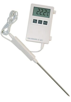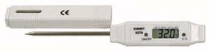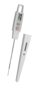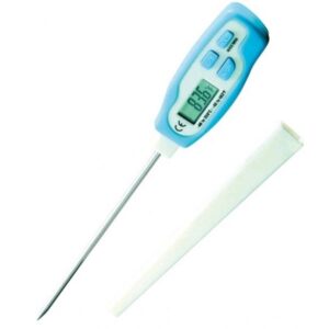 Termometro digitale, in grado di misurare la temperatura da -50 a 250 °C. A tenuta stagna, con sonda fissa in acciaio, punta per penetrazione. Dimensione sonda (LxØ) mm 120 x 3, calibrazione manuale a 0°C. Tastiera a membrana. Autospegnimento e pulsante di fermo lettura. Adatto per settore alimentare.